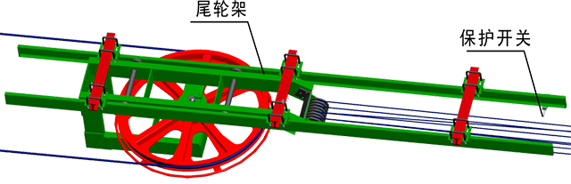 尾輪移至極限位置時,系統(tǒng)會報警并停車,提醒更換鋼絲繩。避免因牽引鋼絲繩過度伸長,導(dǎo)致張緊力下降而引發(fā)的打滑、飛車等安全事故的發(fā)生。