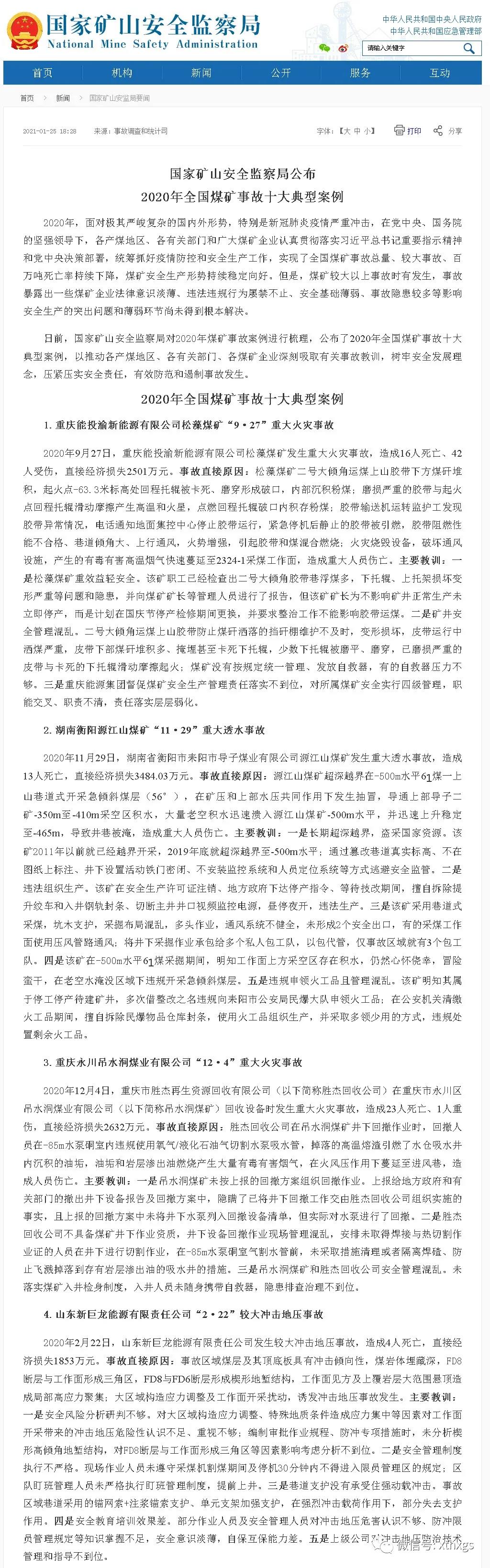 xiao12666@163.com轉(zhuǎn)載:國(guó)家礦山安全監(jiān)察局公布2020年全國(guó)煤礦事故十大典型案例
