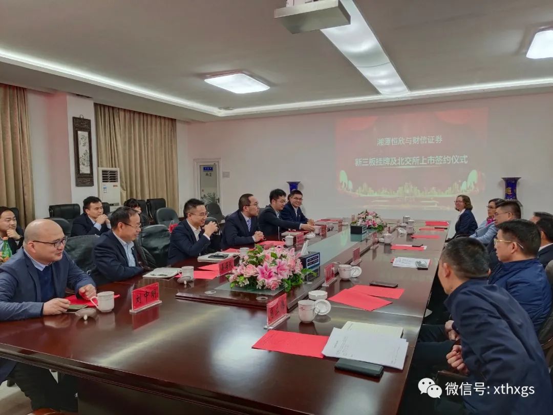 參觀后進(jìn)入會(huì)議室觀看企業(yè)宣傳片,肖董事長(zhǎng)向龍海彧副總裁一行的到來表示歡迎并簡(jiǎn)要介紹公司的情況和發(fā)展規(guī)劃。隨后龍海彧副總裁和李云祥副首席代表分別進(jìn)行了致辭,韶山市副市長(zhǎng)易繼輝發(fā)表了講話。并在大家的見證下,【湘潭恒欣】肖公平和財(cái)信證券副總裁龍海彧簽訂了新三板掛牌及北交所上市協(xié)議。