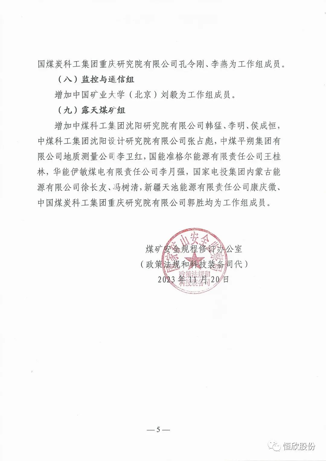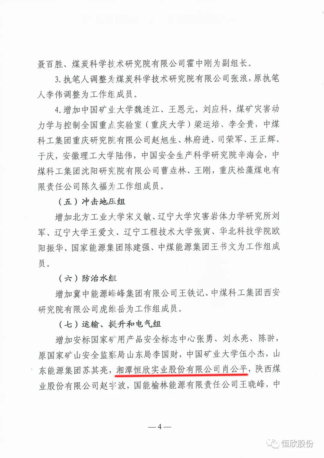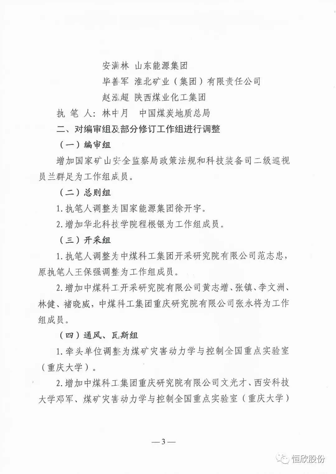 國家礦山安全監(jiān)察局為進一步加強《煤礦安全規(guī)程》修訂組織工作,將增加和調(diào)整的組織機構進行公示,【恒欣股份】加入《煤礦安全規(guī)程》修訂運輸、提升和電氣組機構名單中?!竞阈拦煞荨繉⒉贿z余力為健全完善礦山安全機制,從源頭上防范化解煤礦重大安全風險貢獻一份力量。