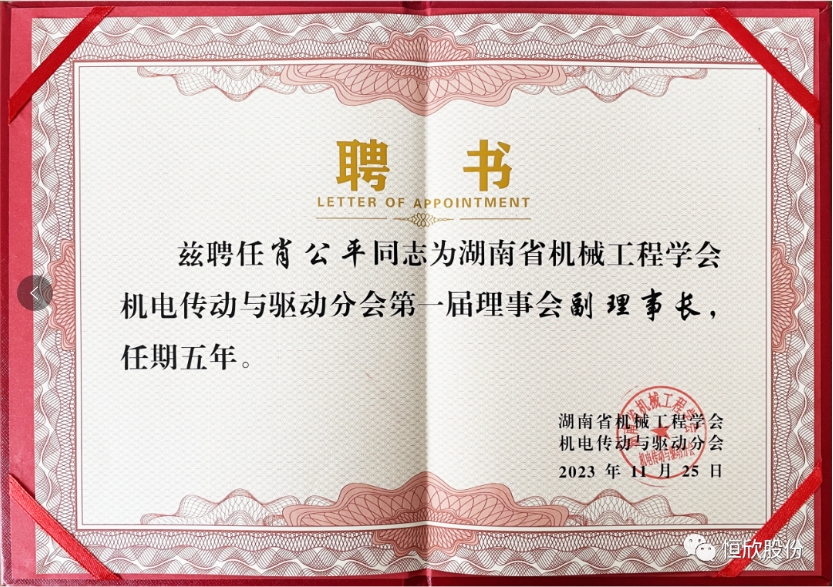 在本次會議中,【恒欣股份】董事長肖公平當(dāng)選湖南省機械工程學(xué)會機電傳動與驅(qū)動分會第一屆理事會副理事長,這是對我司長期堅持技術(shù)創(chuàng)新的有力詮釋,也將進一步推動【恒欣股份】自主創(chuàng)新、自主研發(fā)的動力,為礦山提供更智能、更高效、更安全的機械裝備。肖董事長表示將認真履行好分會副理事長職責(zé),與分會同仁攜手奮進,不遺余力地為分會工作開展貢獻力量。