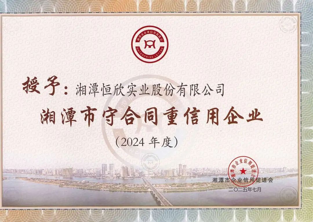 喜訊!【恒欣股份】近日成功獲評“2024年度湖南省守合同重信用企業(yè)”和“2024年度湘潭市守合同重信用企業(yè)”!這是公司連續(xù)第十二年榮獲此項殊榮。