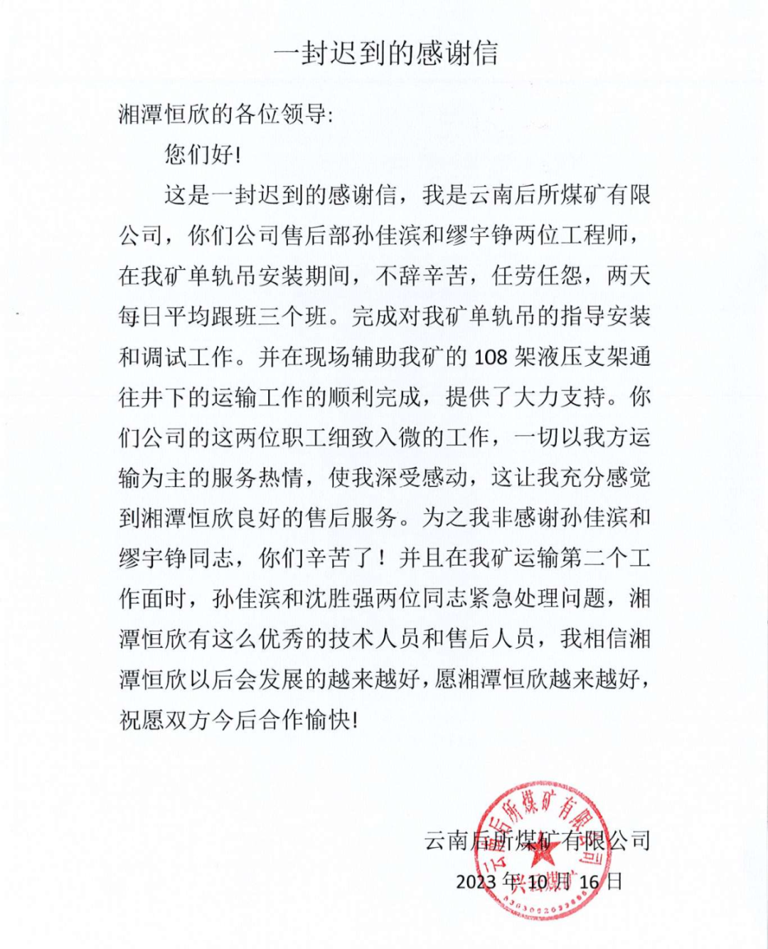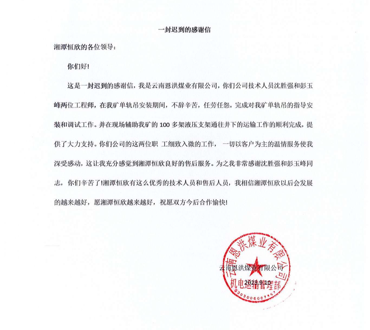 獲得云南恩洪煤業(yè)有限公司的表揚信,沈勝強和彭鈺峰指導完成單軌吊的安裝和調(diào)試工作,并順利將100架液壓支架運往井下表示感謝。