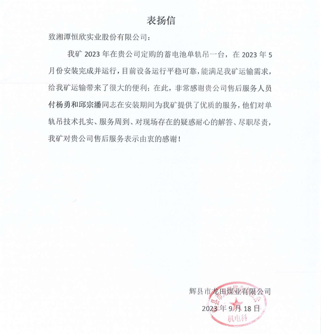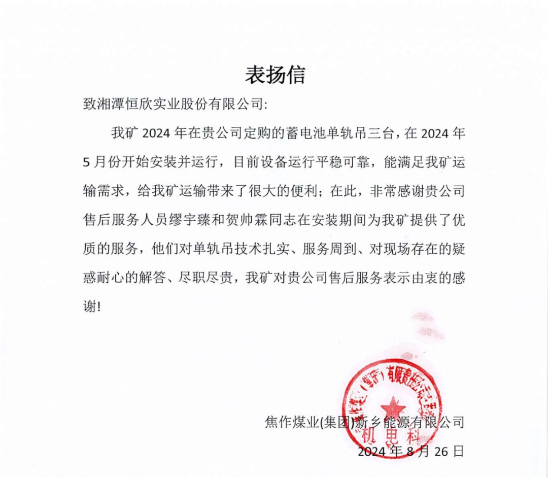 【恒欣股份】喜獲多封客戶含“贊”量頗高的表揚信,生產(chǎn)的單軌吊產(chǎn)品性能和售后服務給予了高度評價,肯定了單軌吊在煤礦井下運輸效率高、爬坡能力強,適應性好、安全性能高、綠色環(huán)保等特點。同時,客戶對售后服務團隊的專業(yè)技能、快速響應和敬業(yè)精神表示欽佩,對【恒欣股份】組織開展線上和線下的技術交流會表示非常的認可,不僅提升了礦山企業(yè)對設備安全運行的管理水平,還確保礦工的人身安全和設備的安全穩(wěn)定運行。