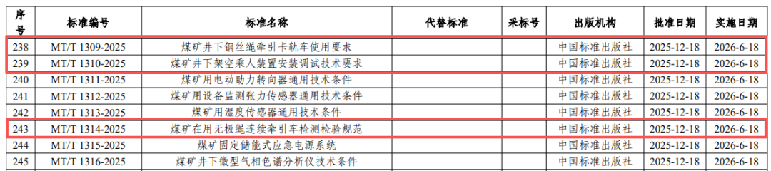 近日,由【恒欣股份】主要牽頭起草的(MT/T 1309-2025)《煤礦井下鋼絲繩牽引卡軌車使用要求》和(MT/T 1310-2025)《煤礦井下架空乘人裝置安裝調試技術要求》,以及參與起草的行業(yè)標準(MT/T 1314-2025)《煤礦在用無極繩連續(xù)牽引車檢測檢驗規(guī)范》,正式通過國家能源局批準并發(fā)布實施。
