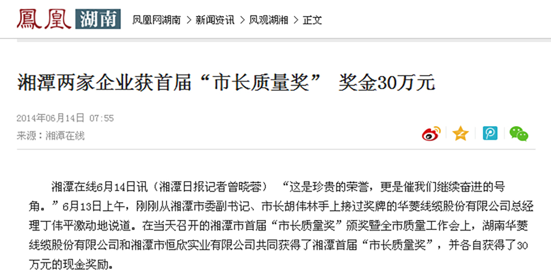鳳凰網、紅網隆重報道:“湘潭恒欣”榮獲湘潭市首屆“市長質量獎”