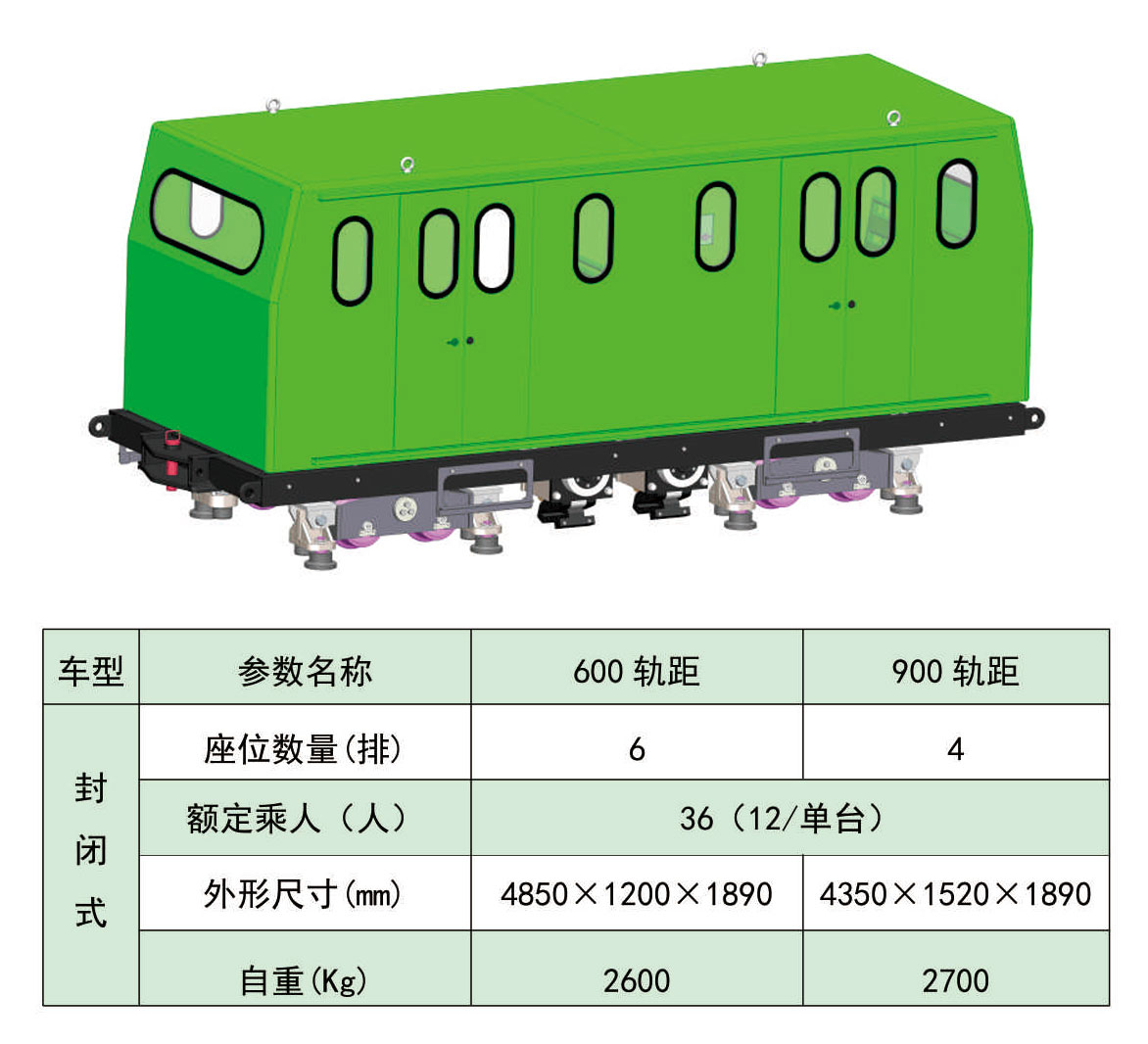 卡軌車乘人車主要為人員乘坐車廂,車架連有轉(zhuǎn)向架和減震器,能夠更好保證乘人車平穩(wěn)、順暢的通過水平彎道、起伏坡道及陰陽軌等工況,可滿足最小水平轉(zhuǎn)彎半徑9m,最小垂直轉(zhuǎn)彎半徑15m的軌道運(yùn)行。根據(jù)結(jié)構(gòu)形式分為半敞式和封閉式。