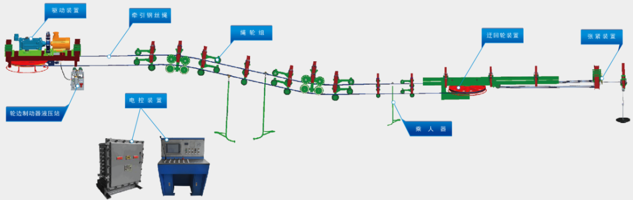 機(jī)械驅(qū)動(dòng)式架空乘人裝置,采用雙輪驅(qū)動(dòng)的主要目的是增大圍包角和摩擦力。采取落地或架空安裝,輸送功率較大,運(yùn)送距離長(zhǎng),僅適用于HK型、HM型抱索器運(yùn)行,但不能繞驅(qū)動(dòng)輪和尾輪運(yùn)行。