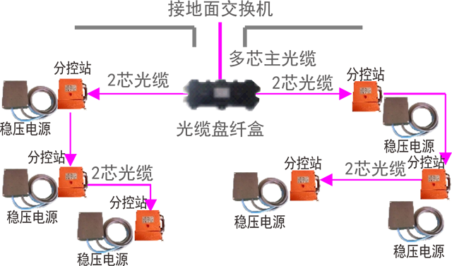 ◆ 多芯主光纜直接連接至地面交換機(jī),利用光纜盤纖 盒分支連接至分站。