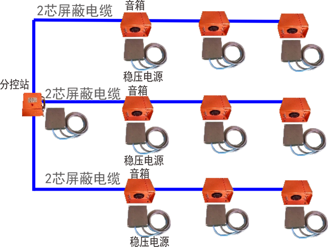 ◆ 音箱通過屏蔽電纜接入分站(允許多支路接入);